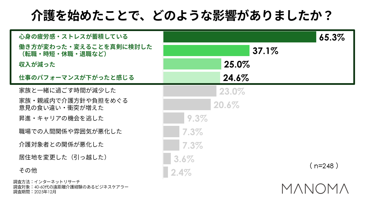 影響の内訳として最多となったのが、「心身の疲労感・ストレスの蓄積」。先に紹介した介護の悩みや不安の具体回答でも「疲れがひどい」「育児との両立にストレス」という回答が寄せられているように、介護という大きな負担で心身のダメージを負われる方の多さや深刻度が見て取れます。