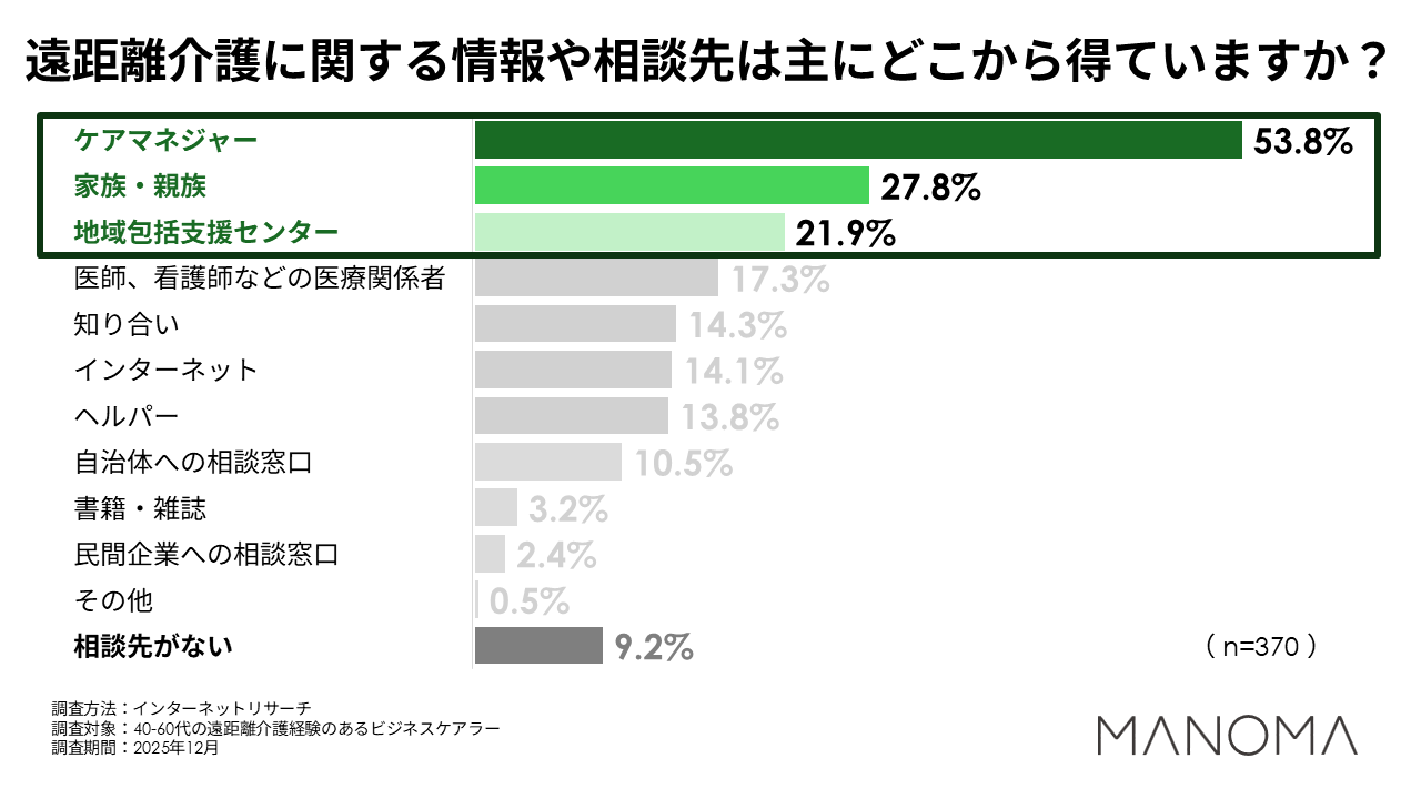 遠距離介護に関する情報を得たり相談をしたりする先を伺うと、「ケアマネジャー」と回答した方が53.8%と最多となりました。次いで、「家族・親族」「地域包括支援センター」が並び、それぞれ20%を超える回答です。