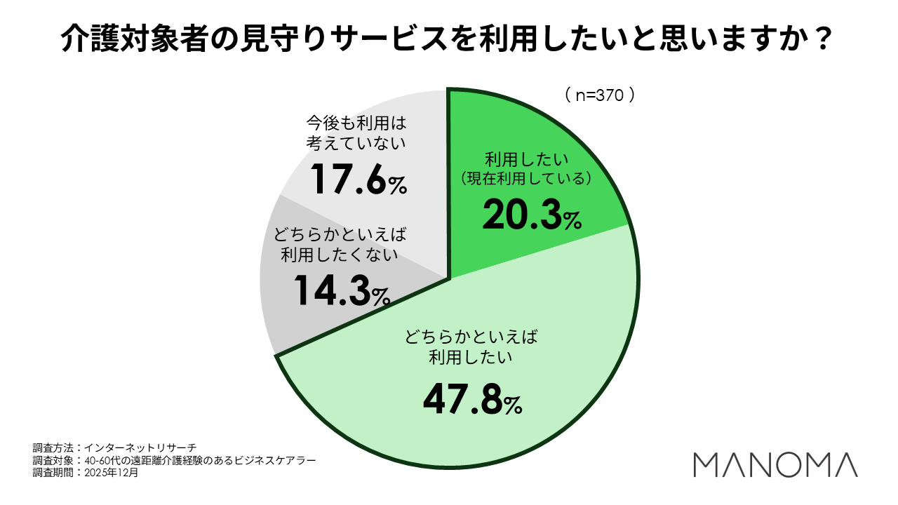 ・見守りサービスを「利用したい」「どちらかといえば利用したい」と答えた方が、68%を超える結果に