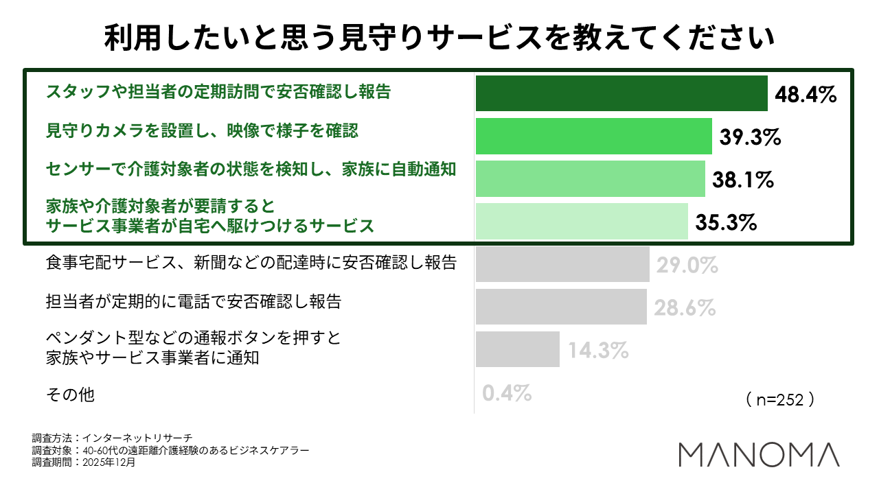 利用してみたいサービスの内訳は、「スタッフや担当者の定期訪問による安否確認」が最多の48.4%。続いて、「見守りカメラによる映像での状況確認」「センサーで介護対象者の状態を検知し自動通知」が約4割、「家族や介護対象者の要請によるサービス事業者駆けつけサービス」が、35%を超える回答です。従来の人による見守りサービスだけでなく、カメラやセンサーなどIoT機器を活用した見守りが上位に入り、遠距離介護をされている方の選択肢となっていることがわかります。
