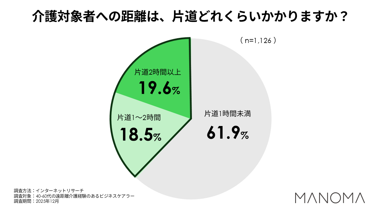 まず、別居での介護経験を持つ方に、介護対象者のご自宅または介護施設への所要時間を伺いました。結果、「片道1時間未満」と回答した方が61.9%となったものの、片道1時間以上かかる方が全体の38.1%に上りました。