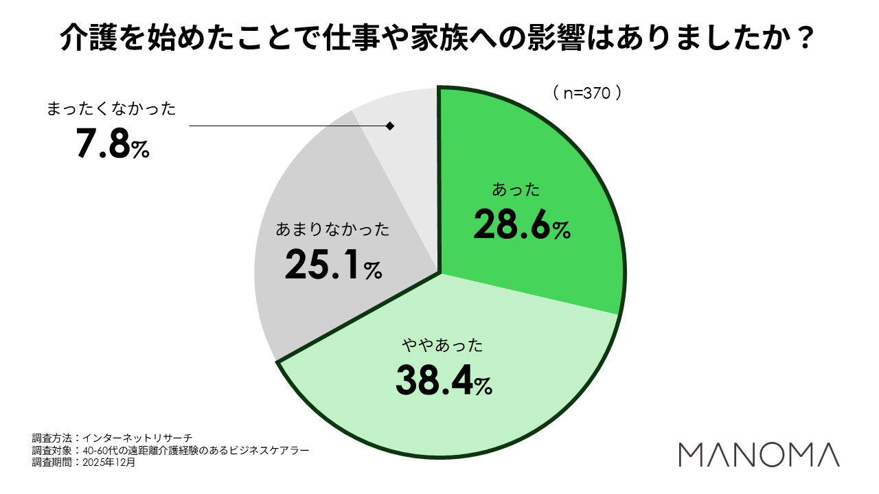 ・67%の方が、介護による仕事や家族への影響が「あった」「ややあった」と回答。退職や収入減に繋がった方も